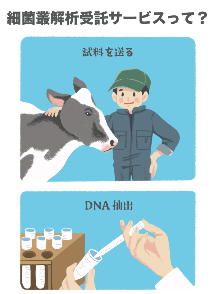 家畜舎内の敷料サンプルや、家畜の唾液、糞便などのサンプルをご提供いただき、次世代シーケンサーを用いた遺伝子配列解析および細菌叢解析を行います。